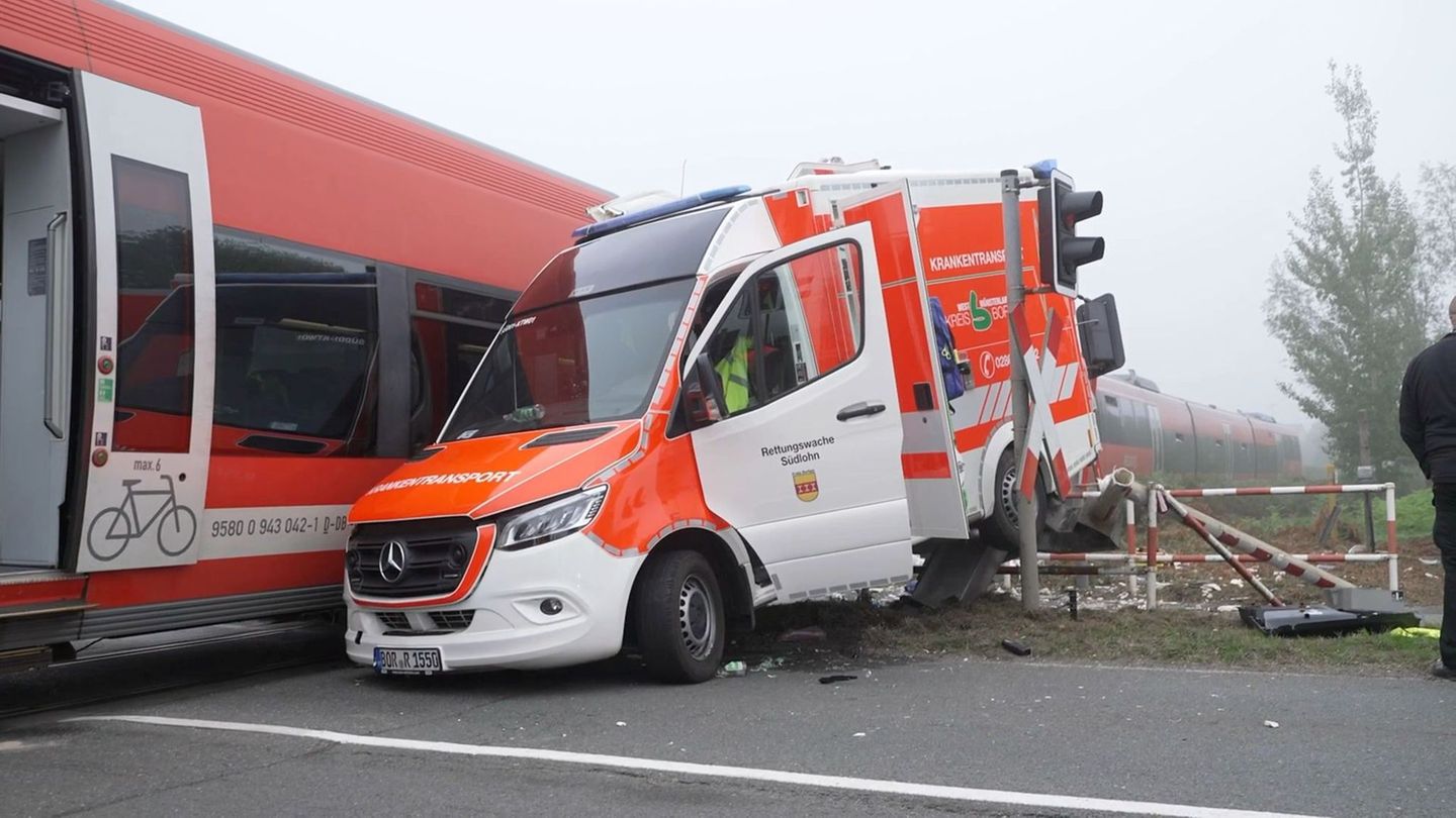 Wegen eines medizinischen Notfalls hält ein Krankentransport im Münsterland ausgerechnet mitten auf einem Bahnübergang. Doch die Schranken schließen sich.