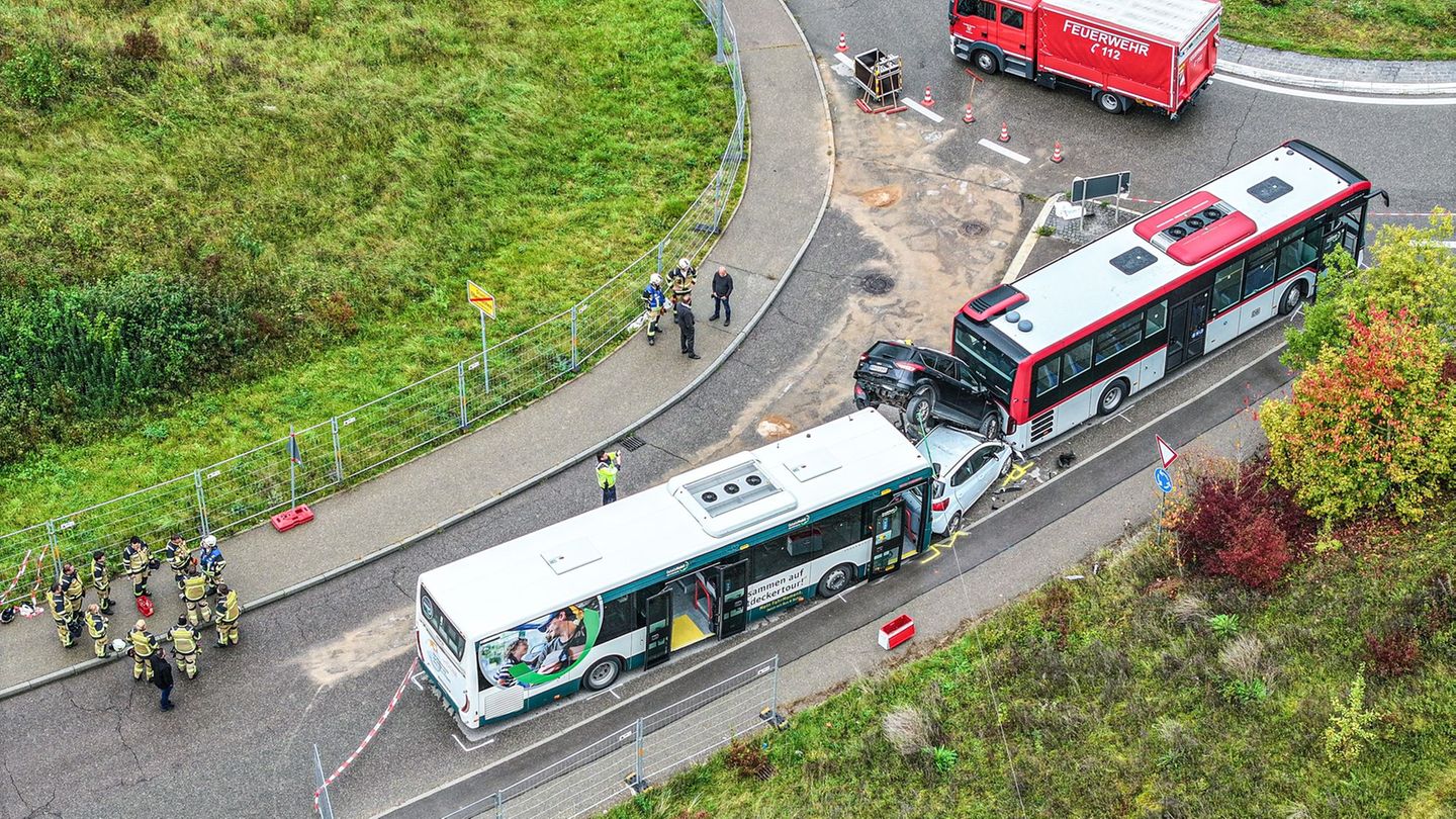 Bei einem Unfall an einem Kreisverkehr im Ostalbkreis hat ein Bus zwei Autos übereinander geschoben. Die gestapelten Autos wurden hinter einem zweiten Bus eingeklemmt. Drei Menschen wurden verletzt.